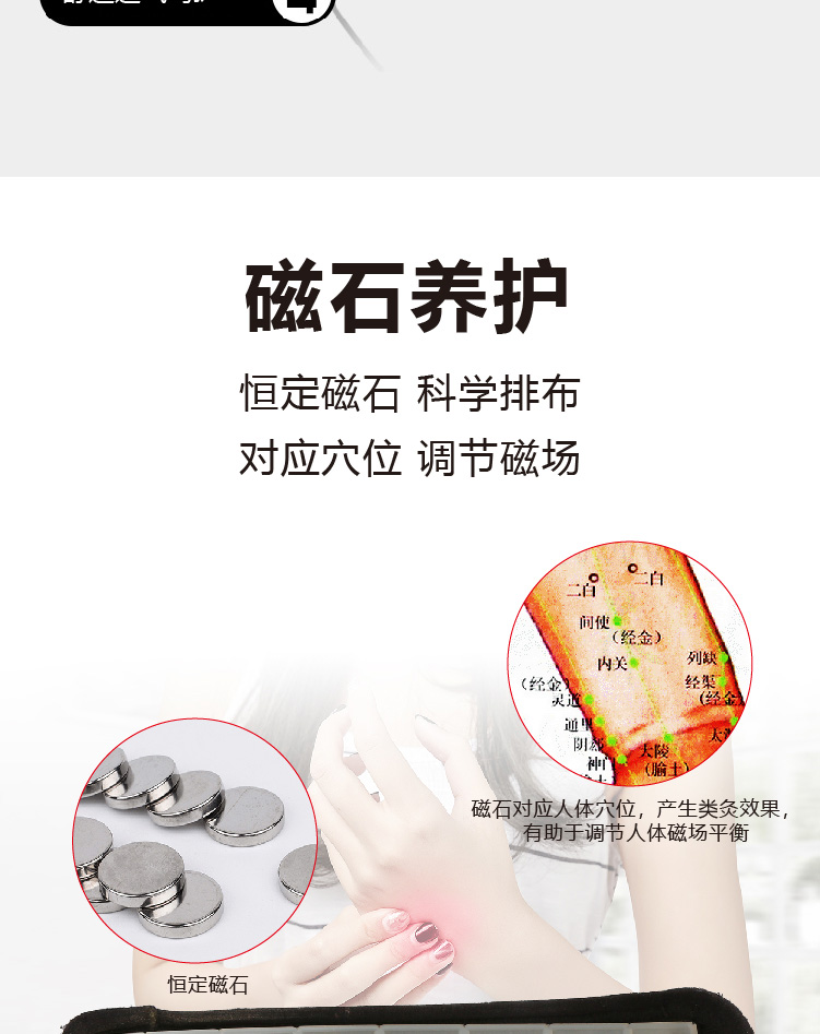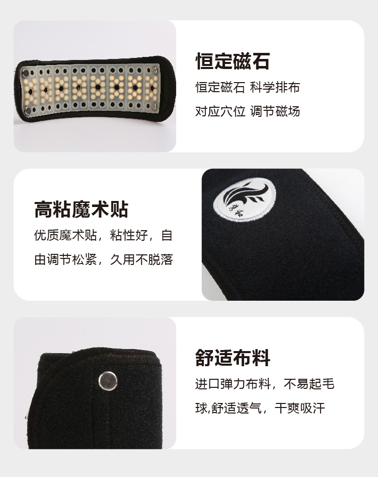 描述:內(nèi)嵌生物磁石,磁場(chǎng)作用于局部穴位,產(chǎn)生類針灸效果,還可用于緩解手腕部關(guān)節(jié)炎,腫脹,麻木等不適。